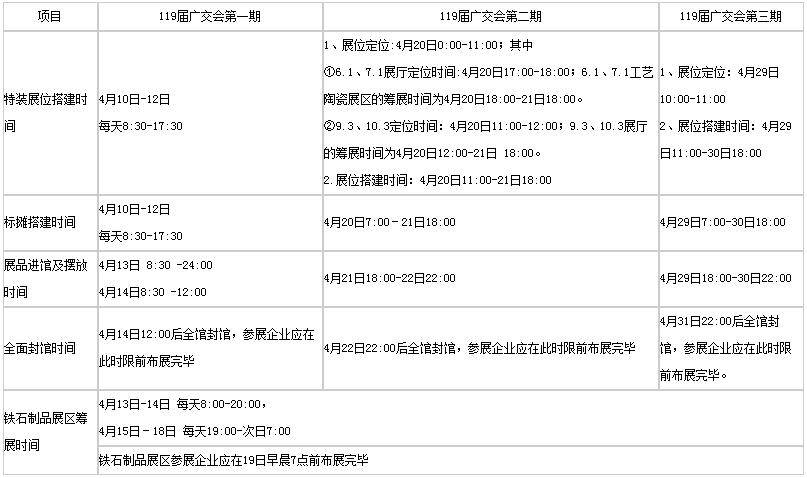 第119届广交会时间安排参照上一届春交会时间,若有变动,以广交会官方公布为准。本届广交会不接受第一、二期任何延时撤展的申请。第三期时间5月5日,需申请加班撤展的企业,可于当天9:30-17:00分别在本区域客服中心现场服务点柜台办理加班手续。