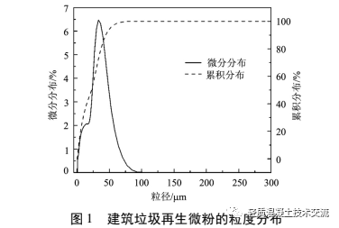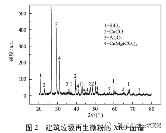 式破碎机破碎, 过 200 目方孔筛得到建筑垃圾再生微粉, 筛余量小于 5% 。建筑垃圾再生微粉的粒度分布和 XRD 图谱分析如图 1、2 所示。由图谱分析