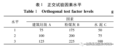 在确定建筑垃圾再生微粉制备陶粒的最佳物料配合比时, 以建筑垃圾、粉煤灰和水泥 3 种主要原材料为影响因素, 进行 3 水平 3 因素正交试验设计, 每组试验中生石灰用量为 15 g, 石膏粉为 30 g, 硅酸钠为 5 g, 正交试验因素水平见表 1。
