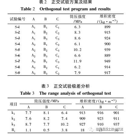 3) 选取陶粒堆积密度的最小 k 值作为物料配合比确定依据, 此时所对应的组合方案为 A2B3C1, 也是正交试验组 S-6, 此 时 陶 粒 的 堆 积 密 度 为 889kg·m - 3。从建筑垃圾的利用率以及水泥的消耗量来综合考虑, 可以选择 A2B3C1 为最优配合比方案。