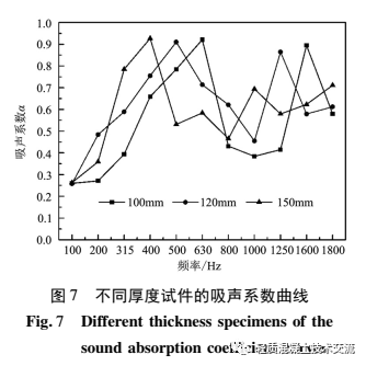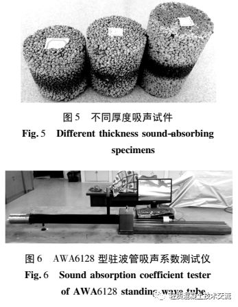 本文以建筑垃圾陶粒为骨料制成的多孔水泥基陶粒吸声降噪材料, 其抗折强度为 2. 5 ~ 3. 3 MPa、抗压强度为 10 ~ 12 MPa, 能够满足水泥基陶粒吸声材料抗折强度大于 2 MPa、抗压强度大于 8 MPa 的力学性能要求。经过试验得到地铁轨道交通吸声降噪材料的配合比为: 粒径范围为 1 ~ 8 mm 陶粒为60% ~ 65% 、水泥为 30% ~ 35% 、水灰比为 0. 24 ~0. 28、外加剂为 0. 5% ~ 1. 5% 。将各材料组分进行混合拌制, 制作出直径为 96 mm, 高度分别为 100mm、120 mm、150 mm 的圆柱体吸声试件, 如图 5 所示。采用杭州爱华 AWA6128 型驻波管吸声系数测试仪进行材料吸声系数测试, 测试仪如图 6 所示。采用声学驻波管法测试出陶粒吸声材料的吸声系数曲线, 如图 7 所示 。